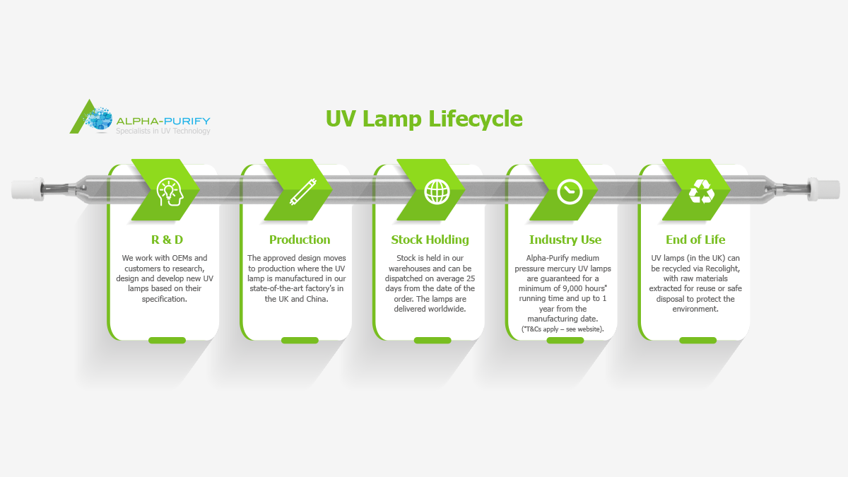 Here at Alpha-Purify, we are proud of the quality and manufacturing standards of our medium-pressure UV lamps. And to help illustrate this we have created this infographic showing the lifecycle of our lamps from R&D through to recycling.