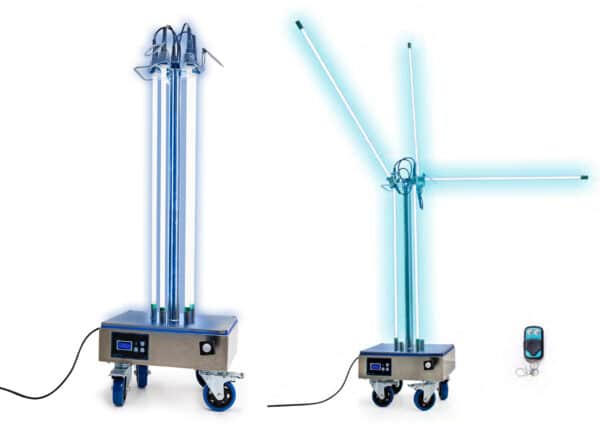 This device is mobile, on wheels, enabling you to move it to any desired location. The UVC lamps can be positioned, and angled (0-180°), in multiple ways. This provides 360° effective disinfection in any environment or space.