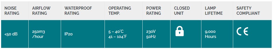The UVETTA Suspended works by using fans to pull air into the system and pass it through UV-C lamps, which are completely enclosed within the unit before expelling clean air out the other side. The UVETTA Suspended system can be operated remotely through an app on your smart device, allowing you the convenience of operating the device from anywhere in the room.